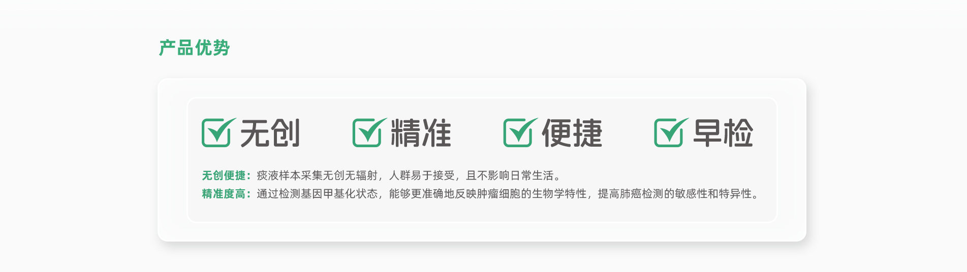 會(huì)安心?人類HOXB4、SRCIN1基因甲基化檢測(cè)試劑盒(熒光PCR法)于2025年5月29日正式獲批上市,這是首個(gè)痰液肺癌甲基化檢測(cè)試劑盒。 會(huì)安心?通過(guò)解讀痰液中脫落腫瘤細(xì)胞的基因異常改變(人類HOXB4、SRCIN1基因甲基化)進(jìn)行肺癌的早期檢測(cè),幫助發(fā)現(xiàn)患者早期肺癌病變情 況, 有希望將肺癌阻斷在早期階段,從而達(dá)到預(yù)防和根治肺癌的目的