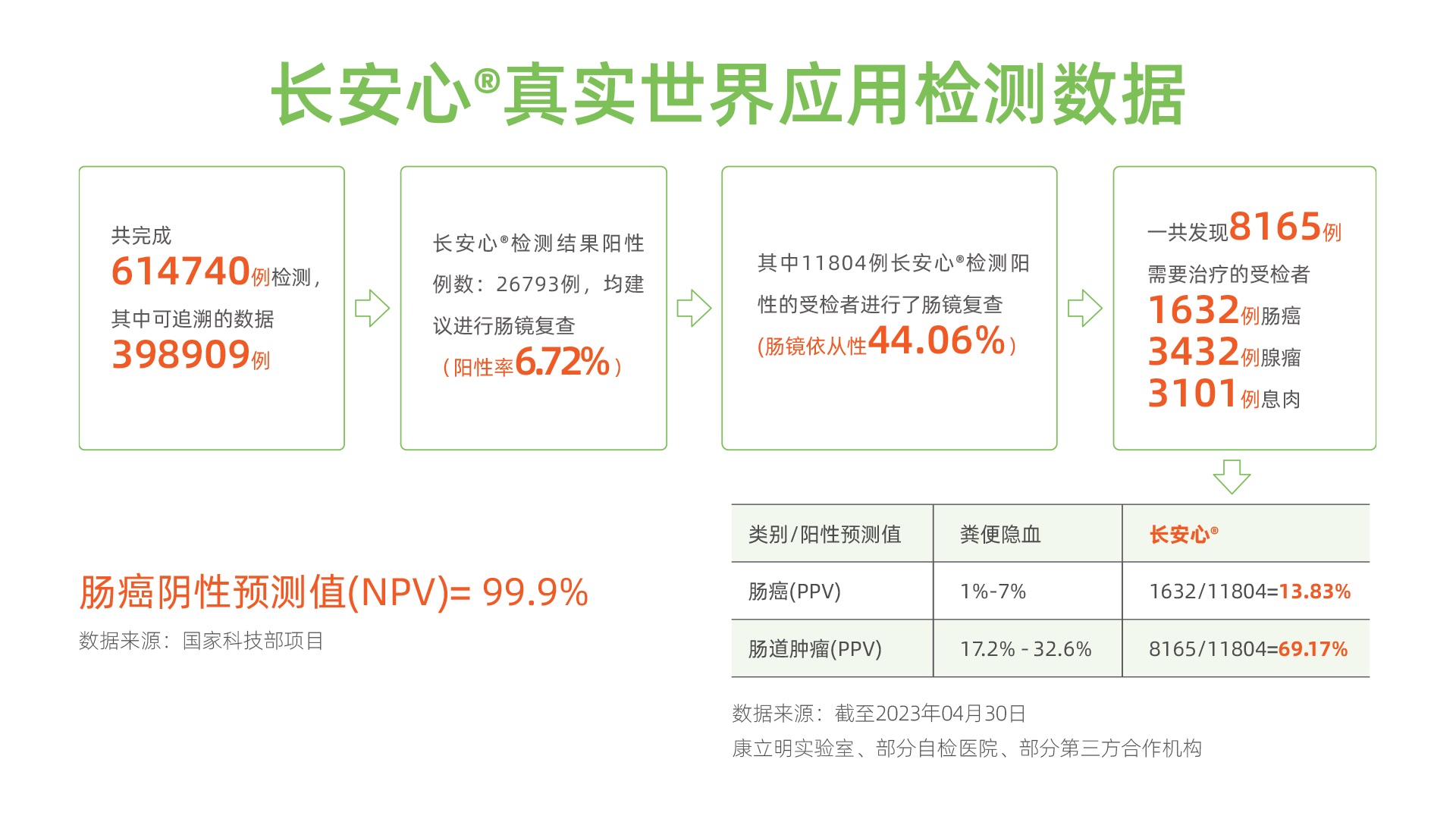 活動現(xiàn)場,康立明生物發(fā)布最新的真實世界應用檢測數(shù)據(jù)。來自康立明醫(yī)學檢驗實驗室、部分自檢醫(yī)院、部分第三方合作機構的數(shù)據(jù)顯示:截至2023年4月30日,長安心®共完成614740例檢測,其中可追溯數(shù)據(jù)398909例。長安心®檢測結果陽性數(shù)26793例(陽性率6.72%),均建議進行腸鏡復查,其中11804例長安心®檢測陽性受檢者進行了腸鏡復查(腸鏡依從性44.06%),一共發(fā)現(xiàn)8165例需要治療的受檢者,其中腸癌1632例、腺瘤3432例、息肉3101例,腸癌陽性預測值(PPV)13.83%,腸道腫瘤陽性預測值(PPV)69.17%,腸癌陰性預測值(NPV)99.9%,為千萬家庭的腸道健康保駕護航。