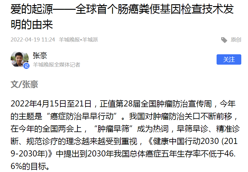全國腫瘤防治宣傳周期間羊城晚報客戶端汪建平教授專家訪談、“愛的起源”腸癌早篩技術(shù)發(fā)明由來等媒體報道,更是聚焦醫(yī)學(xué)人文領(lǐng)域,通過表現(xiàn)科研人員在攻克結(jié)直腸癌防治難題的歷程,側(cè)面?zhèn)鞑ソY(jié)直腸癌早篩知識,讓人們認(rèn)識到新型腸癌早篩技術(shù)研發(fā)的不易,進(jìn)一步提升民眾的自身腸癌防治科學(xué)素養(yǎng)。