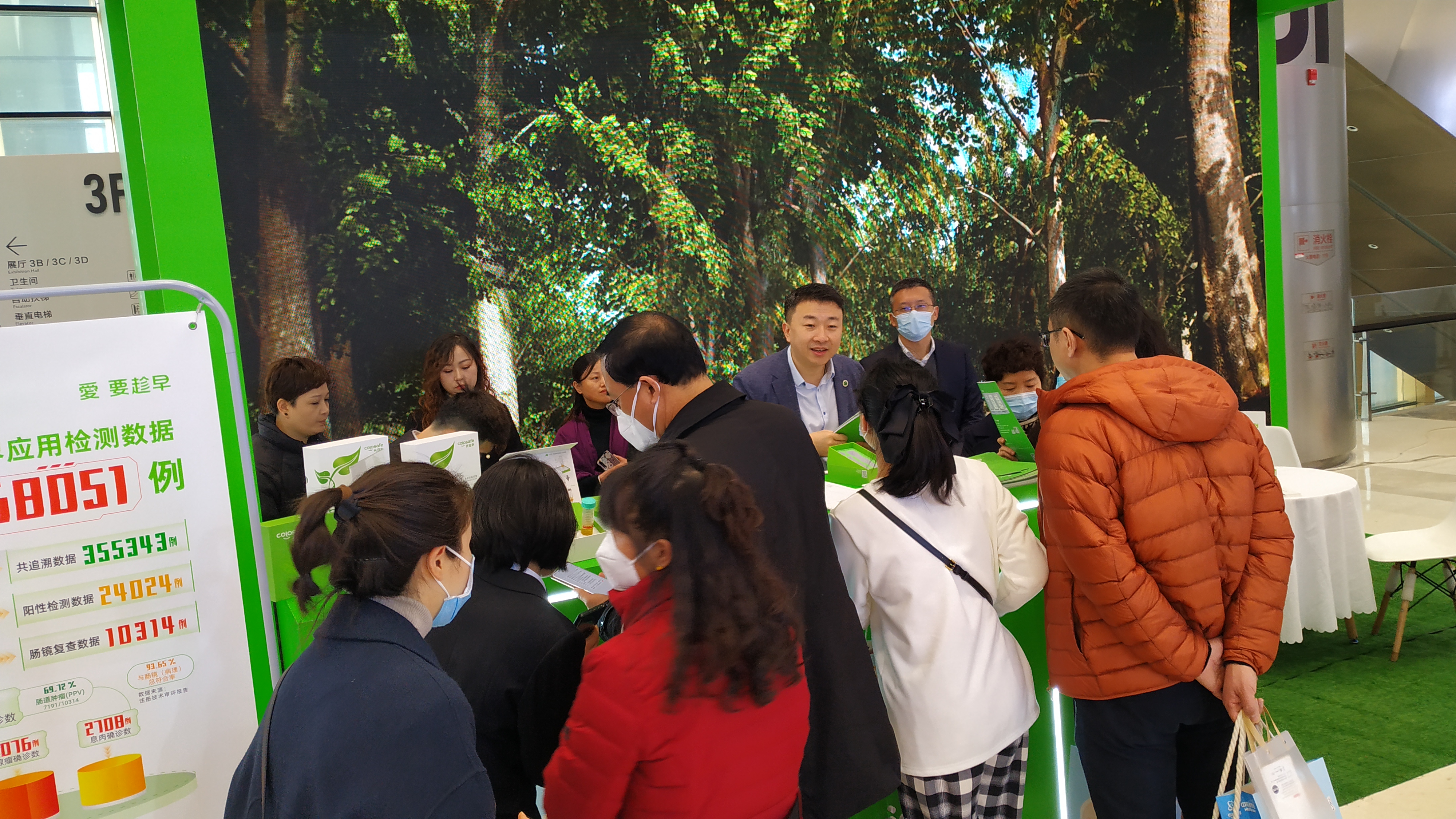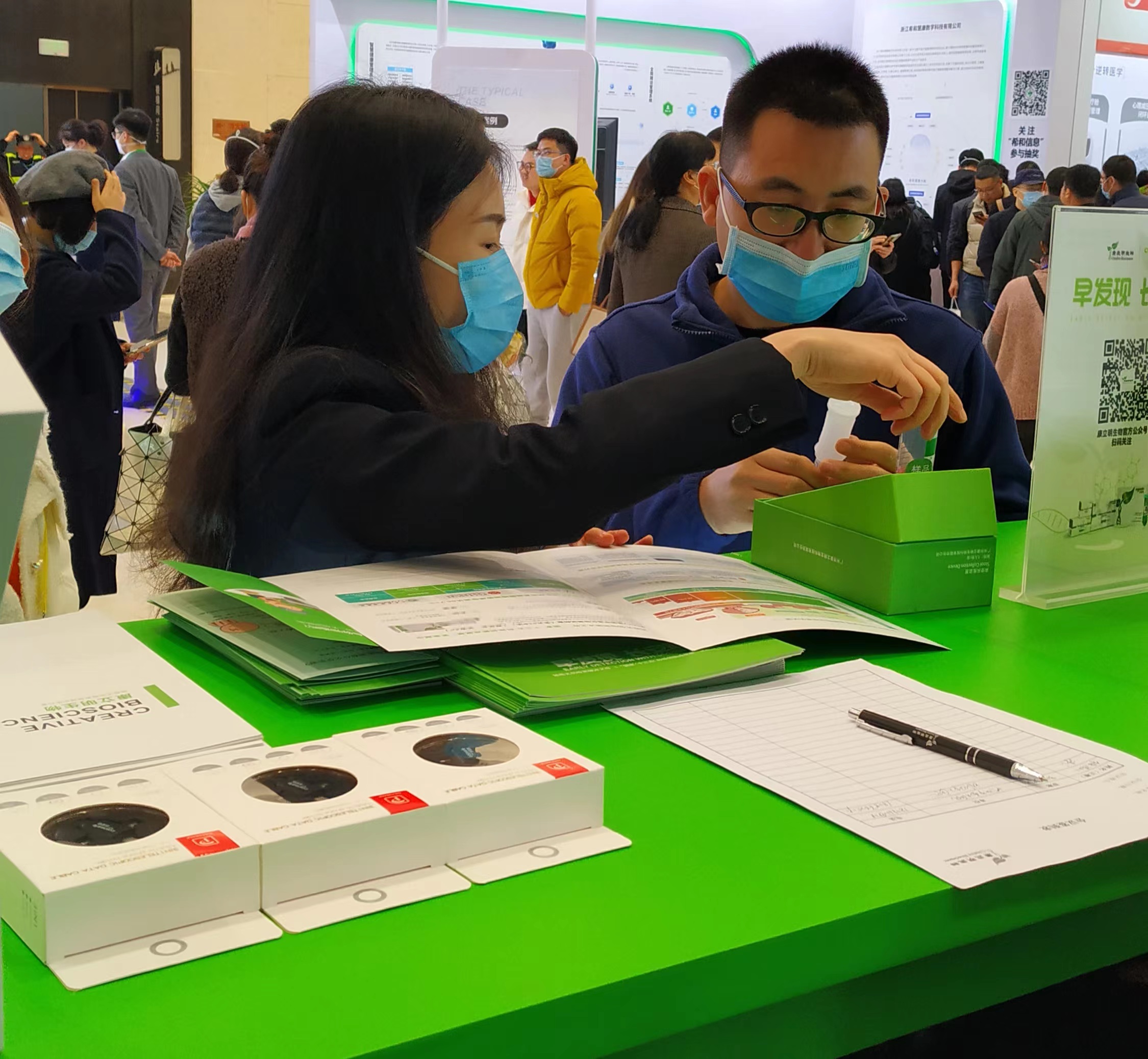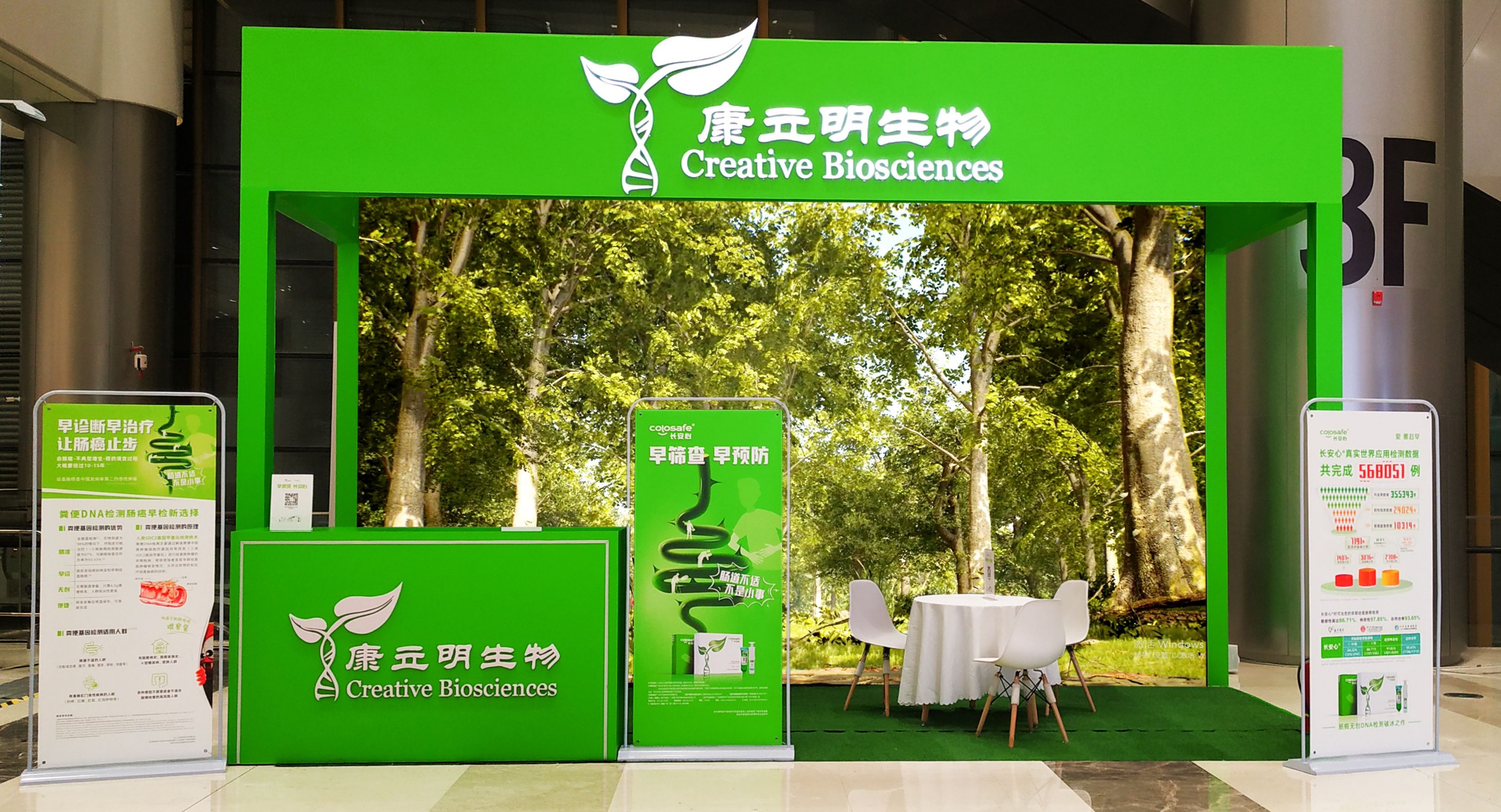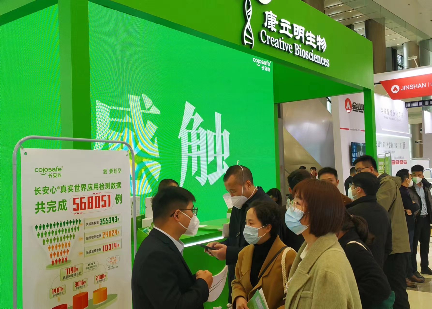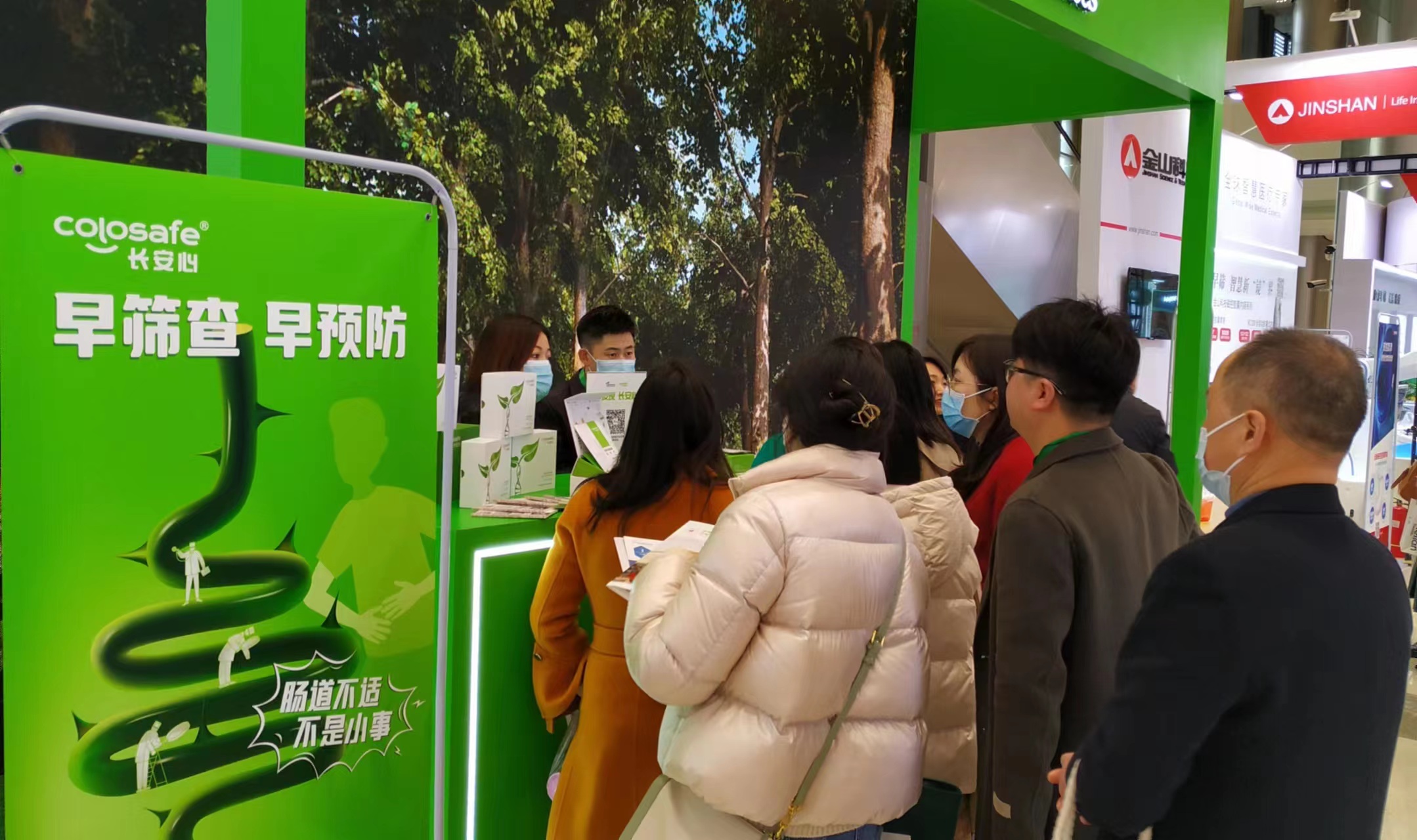康立明生物攜長安心®糞便DNA腸癌檢測產(chǎn)品參展??盗⒚魃镎刮灰源笞匀粸樵兀源砩腿f物生長的綠色為抽象概念,構(gòu)建出一個Green Box,與現(xiàn)場展出的長安心®小盒子,在形態(tài)到寓意上相呼應(yīng),吸引了眾多專家、嘉賓到康立明生物展位打卡、交流,探討長安心®為健康管理系統(tǒng)提供的價值與成效。