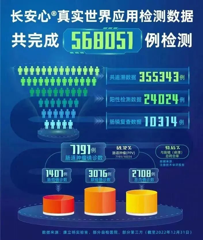作為持續(xù)披露真實世界應(yīng)用數(shù)據(jù)的腸癌糞便基因檢測產(chǎn)品,截至2022年12月31日,長安心®共完成568051例真實世界應(yīng)用檢測,其中355343例應(yīng)用數(shù)據(jù)可追溯,24024例受檢者長安心檢測結(jié)果陽性(陽性率6.76%),其中10314例陽性檢測結(jié)果的受檢者進(jìn)行了腸鏡復(fù)查(腸鏡依從性42.93%),有7191例受檢者確診腸道腫瘤,其中1407例腸癌,3076例腺瘤,2708例息肉。